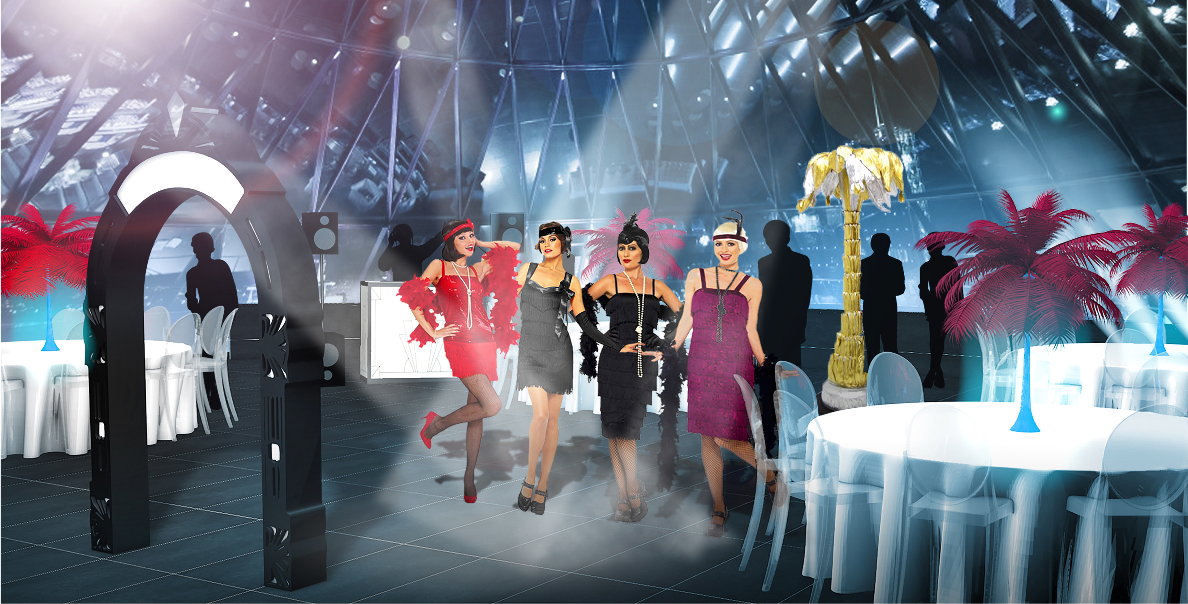 1920s Art Deco: I designed a gold-accented lounge environment, using geometric furniture and period-appropriate props to create a "Great Gatsby" aesthetic within the modern glass structure.