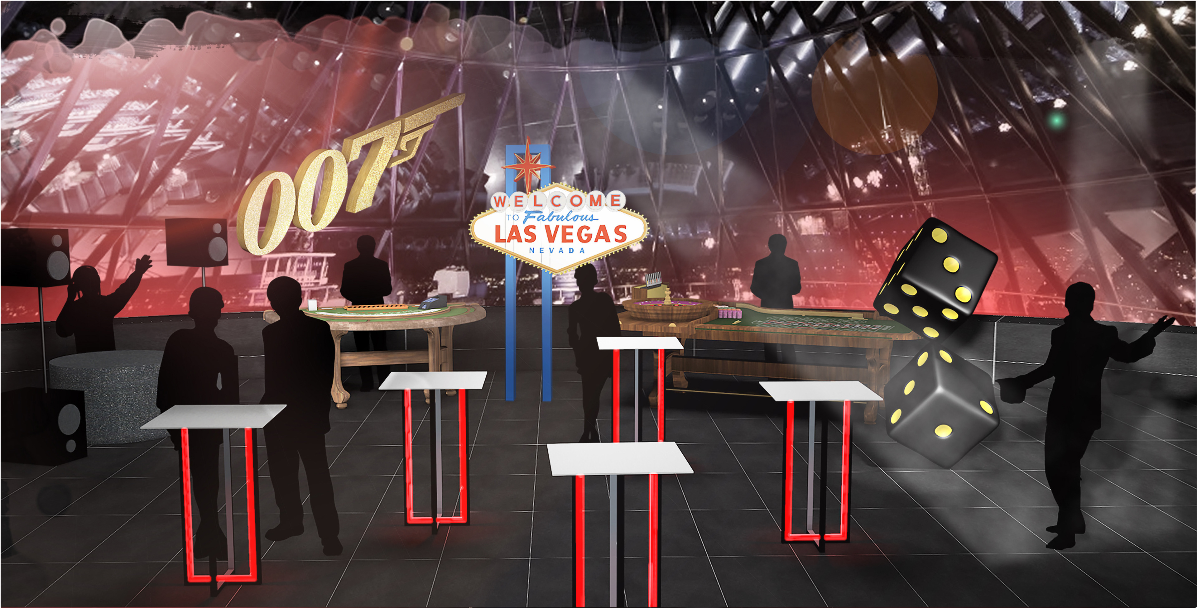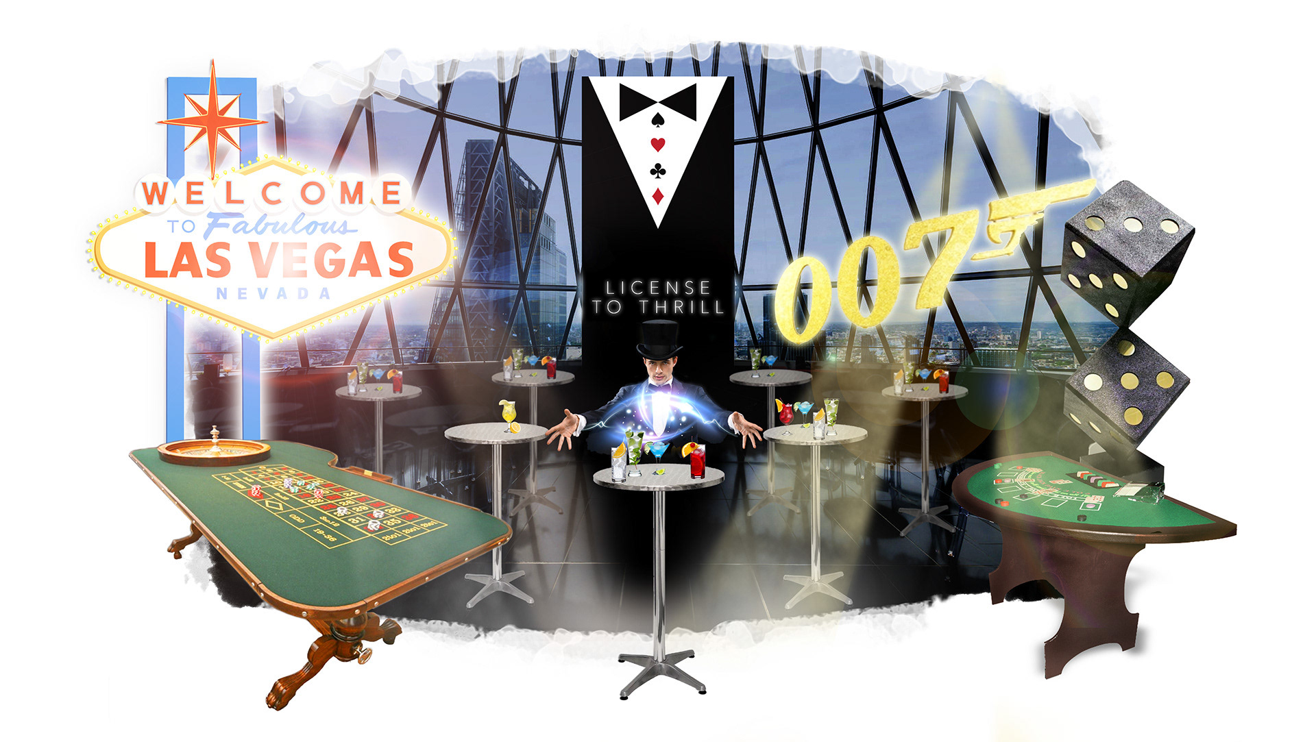 High-Stakes Casino: A high-end Bond-style setup featuring professional gaming tables and silhouette branding, positioned to maximize the backdrop of the London skyline.