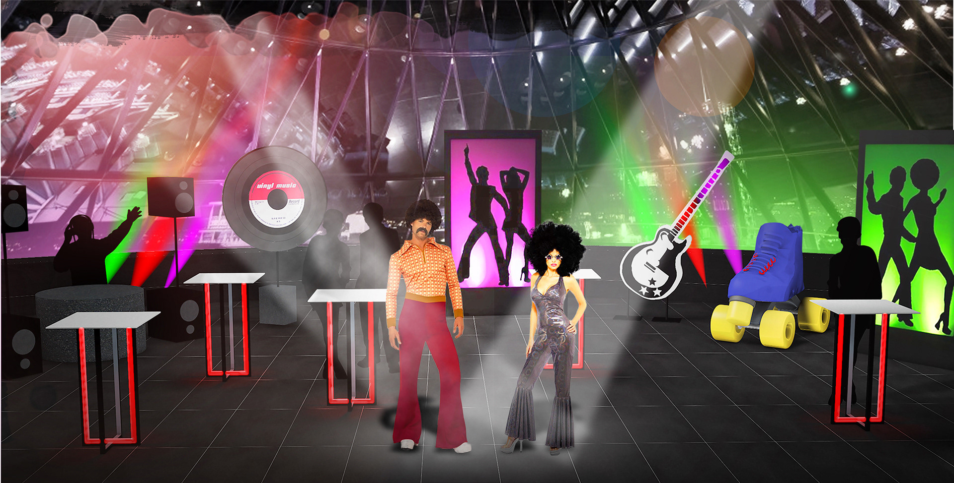 Retro Disco: A vibrant, neon-led concept focusing on reflective surfaces and high-energy lighting to show how the dome would glow after dark.