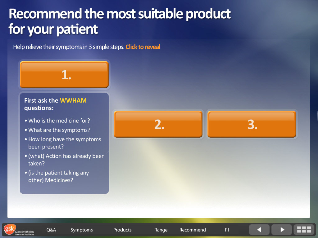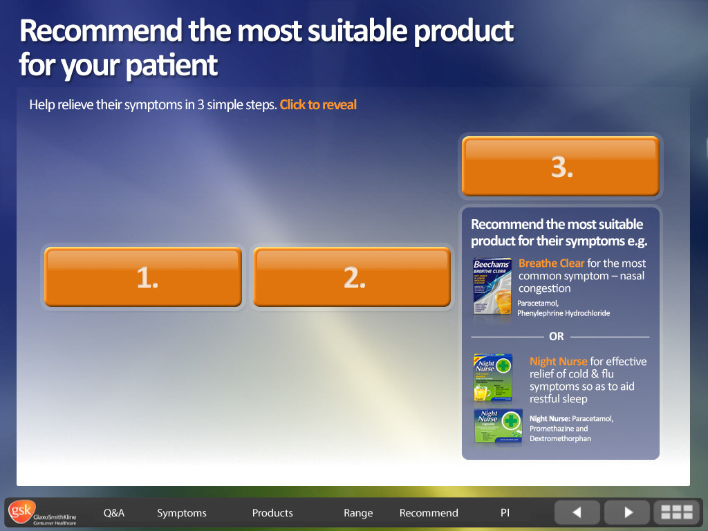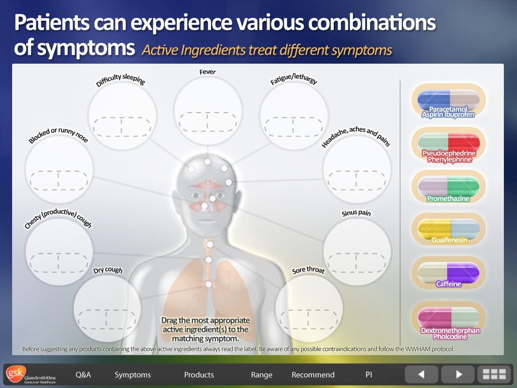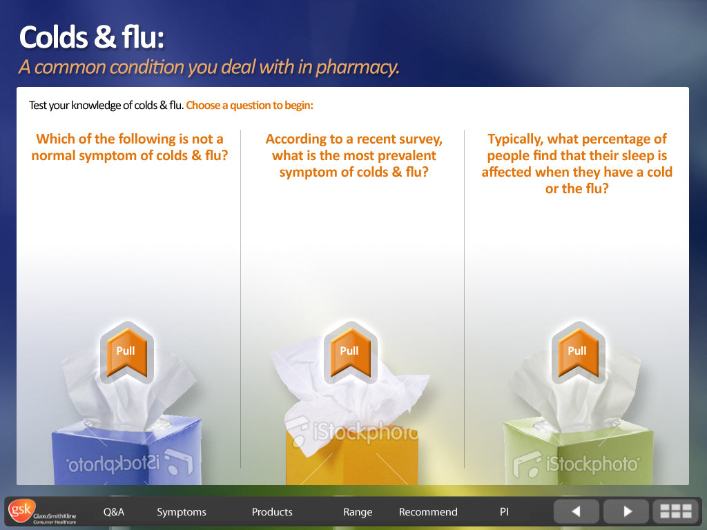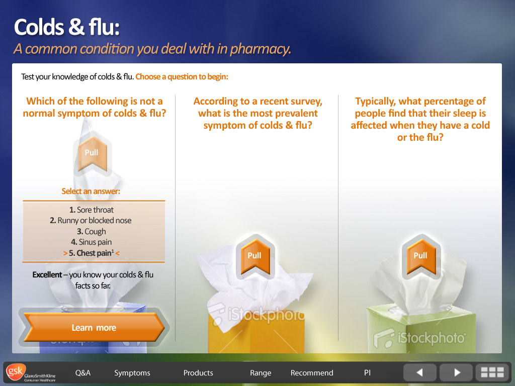 GSK Flue - screen design for interactive eLearning course.